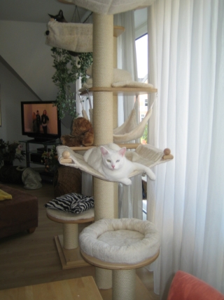 Musstet ihr ihn selber zusammenbauen? Wenn der Verkäufer so kundenunfreundlich war, dann würde ich das publik machen - vielleicht hat er eine Website? Aber egal, jedenfalls steht er jetzt und sieht wirklich toll aus. Ich habe nur die Hälfte von diesem Kratzbaum stehen und meiner ist auch nicht sooo hoch.
