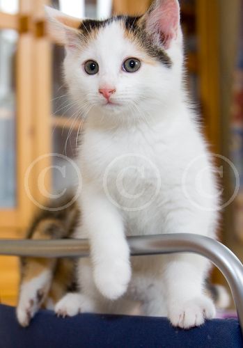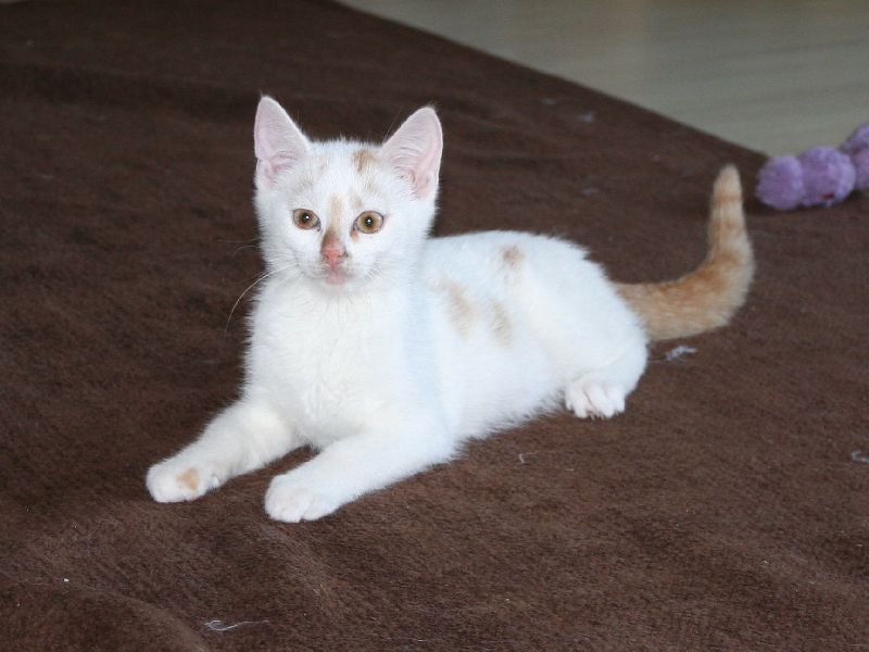 Luna, geb. etwa Mai 2011, ist weiss, mit schwarzen und roten Tupfen, ebenfalls sehr lieb -hat noch nie gekratzt- und spielfreudig.