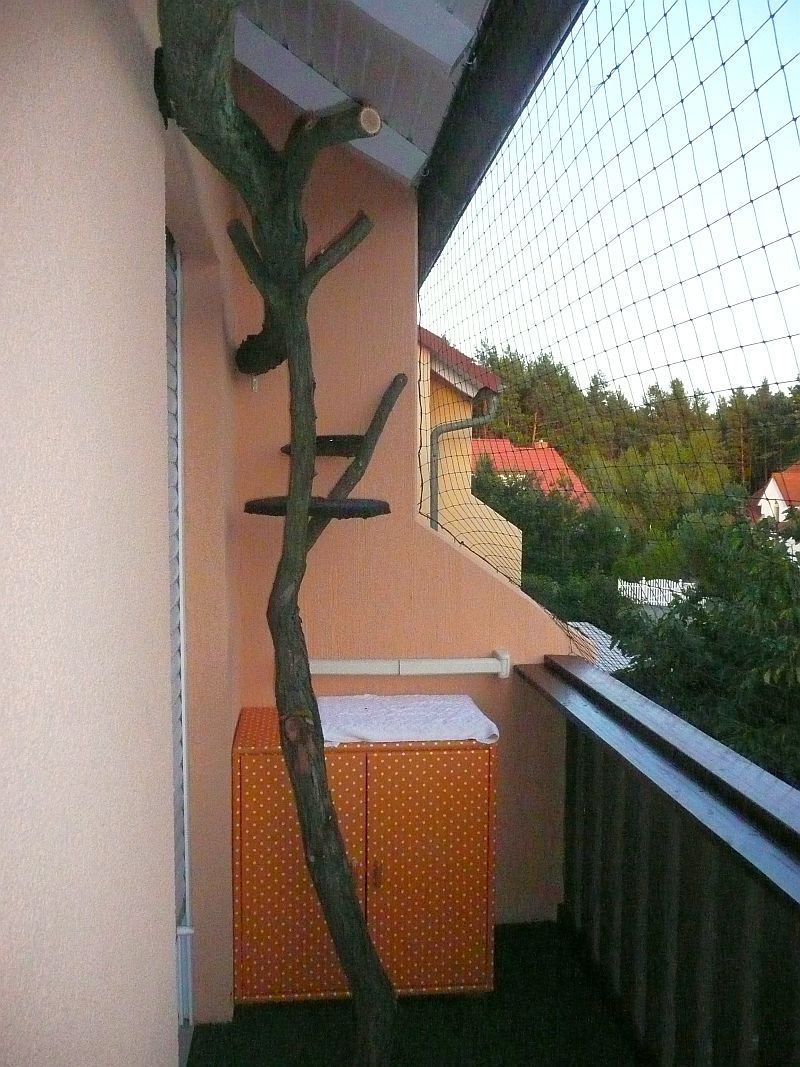 danke für eure zahlreichen Tipps. Ich denke ja auch, dass wenn ich die Katzen jetzt regelmäßig ein paar Stunden raus lasse, dass sie sich an die Temperaturen gewöhnen und sich ihr Fell dann anpassen wird. Eine Kuschelkiste ist auch kein Problem. Und der Schrank, der auf der einen Seite steht, wird auch noch umfunktioniert. Bisher ist er leer und dient nur als Sitzplatz. Es ist jedenfalls richtig niedlich, wenn Maja und Marly morgens vor der geschlossenen Schlafzimmertür mauzen, damit ich sie dann auf den Balkon lasse. Abends brauche ich meist ein Leckerli, um sie wieder hereinzulocken. Maja balanciert am liebsten über den großen Stamm und kratzt an ihm herum, während Marly auf dem höchsten Sitzplatz Ausschau nach Vögeln hält.