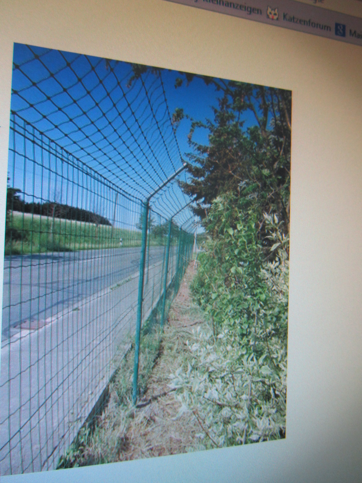 Hallo Kathi, ich hoffe man kann den Zaun auf dem Foto richtig erkennen, habe das Foto vom Monitor aufgenommen. Oben auf dem Zaun ein Katzennetz spannen, welches im Winkel nach innen abgeknickt ist, geht das? Mach Dich nicht verrückt, Du weißt doch, wo Du den Ausreißer evtl. findest - beim Rottweiler....  , ist ja irre, vertragen die sich so einfach ? LG Marla
