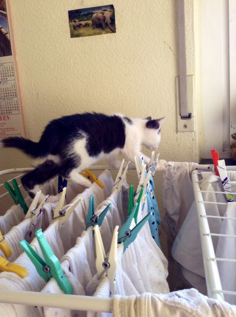 Ein Actionfoto. Hier ist Kimba bei seiner Lieblingsbeschäftigung Wäsche abnehmen. Habe mal drei Tage nach nem BH gesucht. Ich danke euch. Ich weiß ich werde ihn mit der Zeit lieben aber Aihas Platz in meinem Herzen war soooo groß. Niemand kann sie ersetzen. Vielleichg liegt es auch am beruflichen Streß. Da kommt man heim und findet ein Chaos vor da ist man genervt. Aber er guckt dann so unschuldig und dann kann ich ihm nicht böse sein....