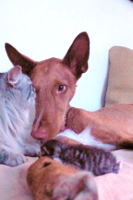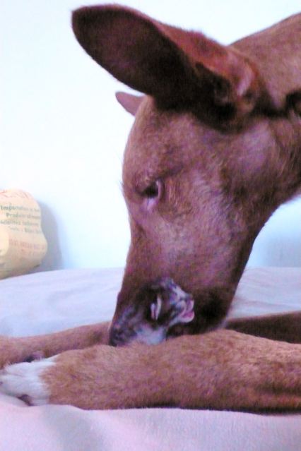 Sonst ist alles beim Alten; ich komm kaum aus dem Haus, da ich immer füttern muss, aber dafür habe ich grosse Hilfe bekommen, mein Podencorüde Feodor spielt Papa, er putzt ihn, massiert ihm richtig professionell das Bäuchlein. Steht immer daneben wenn gefüttert wird. Holt mich aus einem andern Teil der Wohnung wenn ich das Quitschen nicht gerade gehört habe. Perfect team work!