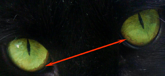 Hallo Ihr Lieben! Unser Paulchen ist jetzt ein Jahr und 2 Monate alt. Jetzt ist mir eine seltsame Augenpigmentierung aufgefallen, von der ich nicht weiß, ob das bei schwarzen Katzen schonmal vorkommen kann wg. mehr Pigmenten, oder ob das eine krankhafte Veränderung ist (wäre schon etwas merkwürdig angesichts des Alters, oder). Ich meine diese bräunlichen, wolkenartigen Strukturen, s. Doppelpfeil. Bei rechten Auge sieht es zudem auch noch aus, als sei die Hornhaut uneben, oder bilde ich mir das nur ein (hoffentlich)? Ich hänge die Bilder an; hat jemand so etwas schonmal bei Katzen gesehen? Bin für jeden Hinweis dankbar! Das arme Kerlchen hat schon als Baby soviel erlitten (Amputation & Aussetzen), bitte nicht auch noch eine ernsthafte Erkrankung... LG, Ulrike
