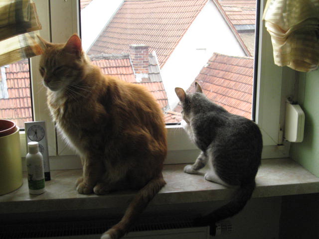 Ich finde die beiden wirklich winzig. Ich habe sie gemessen (Puh...das war schwierig, mit dem Maßband kann man ja soooo gut spielen!!) und bin dabei auf 54 und 56 cm Länge gekommen. Gemessen habe ich ab dem Punkt zwischen den Ohren bis zu der Stelle, an der der Schwanz anfängt. Nicht, dass es mir darauf ankäme, dass meine beiden so groß wie möglich werden, aber ich habe einfach so wenig Vergleich, da ich kaum Leute mit Katzen kenne.