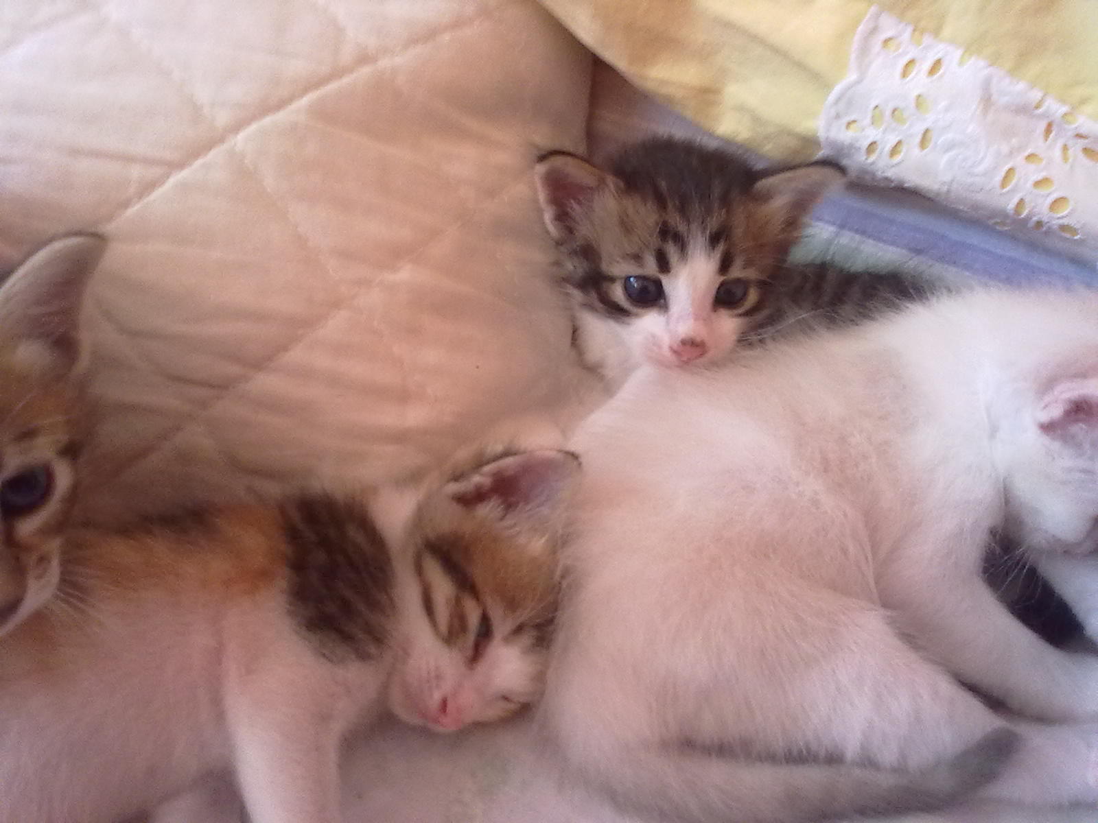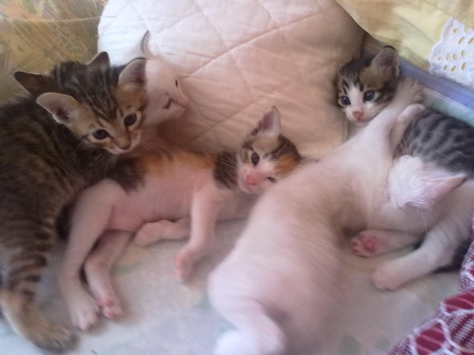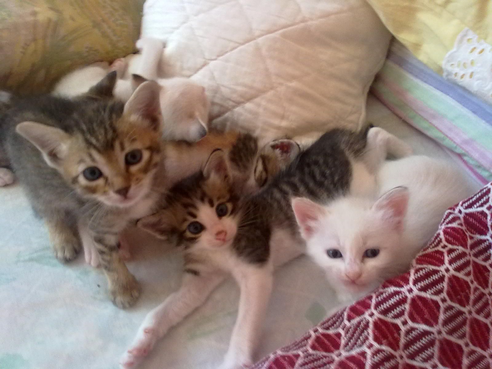 Stolz wie Oscar bin ich...Nachdem mir so ein kleines Luder ins Bett gepieselt hat,musste eine effektive Lösung her.Also kramte ich meine alte Katzenbabypinkelbox hervor,steril gemacht mit Clorex,den besten Sand auf dieser Erde vom Strand geholt,im Schlafzimmer neben den Übernachtungs- karton plaziert uns ausgeharrt,der Dinge die da kommen,Und sie kamen,die Kleinste,die < bunte > setzte sich rein und scharrte,was die anderen anlockte.Die standen wie die Orgelpfeifen ringsum und ,ist doch eistaunten,was da los ist.Unter lautem Quäken machte die Kleine Pipi,dachte,wann ist sie bloss fertig ? Und schon war die nächste drin.Für die anderen hiess es warten,Sand musste gewechselt werden.Die beiden Weissen,die nicht mehr so weiss sind,färben sich allmählig,sind ja die Grössten,die habe ich in Nettes grosse Schüssel gesetzt.Mit ihren 4 Wochen bin ich froh,dass es beim ersten mal gleich geklappt hat,das ist eine grosse Entlastung für Nette,die nur noch Haut und Knochen ist.Die Kitten trinken noch ständig und das schlaucht,werde beginnen,zuzufüttern. Gestern mit dem TA gesprochen,der mir wärmstens empfohlen wurde,auch weil er ins Haus kommt ( hat keine Praxis ),in ca 2-3 Wochen will er Nette / Rico kastrieren.Solange es geht,sollen sie bei der Mutter trinken,weil die Milch die Beste ist ! Das war mein Bericht über das 1.mal vom kleinen Geschäft  Liebe Grüsse  Chris