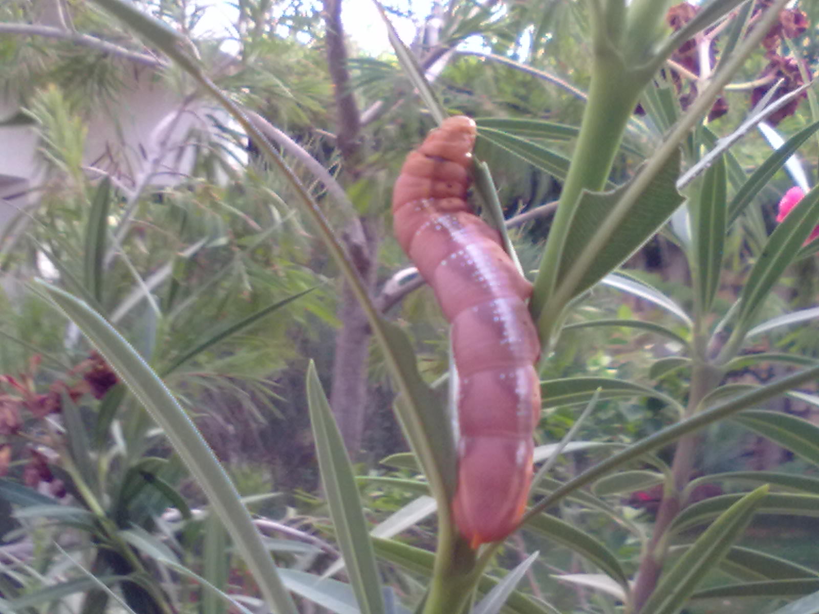 eigendlich ist es ein < Katzenforum > und das ist ein < Tier >,von dem ich nicht mal wusste,dass es existiert !!! Dabei war mein Oleander schon oft angefressen,aber das waren Riesenheuschrecken...die überfallen ja ganze Landstriche hier. Nun guckt euch das an,hatte einen Schock,konnte es trotzdem nicht entsorgen,vielleicht fällt es unter < Tierschutz > hahaha...,besonders hier.Jedenfalls lebt es nun an einem anderen Platz...