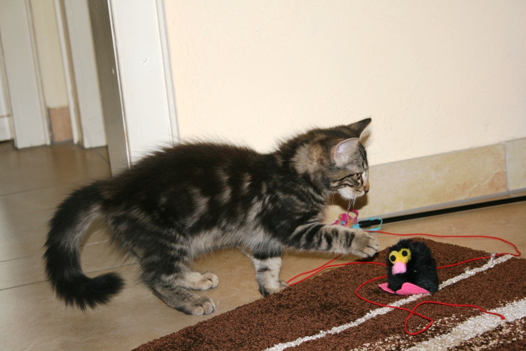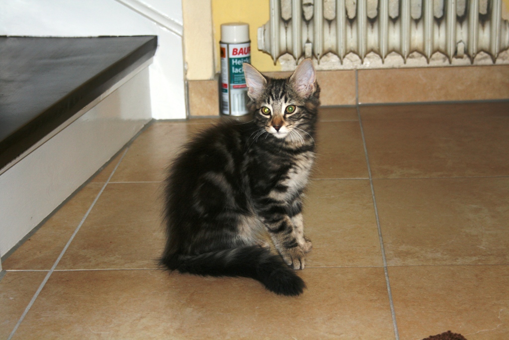 Hallo alle zusammen, ich heiße Eowyn und bin eine Norwegische Waldkatze. Das Licht der Welt habe ich am 16.04.2010 erblickt und heute bin ich zu Tobias und Beate gekommen. Noch ist für mich hier alles super neu und ich inspiziere schon den ganzen Tag das neue Heim. Heute habe ich so dolle mit Tobias gespielt, dass ich danach tot müde unter dem Schrank eingeschlafen bin. Davor habe ich allerdings ganz neue Tiere kennengelernt. 5 gaaaaanz große Papageien. Wenn man so ein Würmchen ist wie ich, dann kommen einem die Vögel wie Riesen vor. Ich bin noch immer ganz von der Rolle. Vor allem aber auch, weil ich heute bei der Paula Papagei am Schnabel riechen durfte Da ich Beate und Tobias noch gar nicht gut kenne bin ich auch noch etwas scheu vor der Hand und zurückhaltend. Mir wurde auch erzählt, dass hier noch ein knapp 7 jähriger Kater wohnt, der aber im Sommer den ganzen Tag nur auf Tour ist und nur zum Fressen nach Hause kommt. Leider war er bis jetzt noch nicht da. Beate sagt, dass sie etwas Angst vor der Zusammenführung hat, da der Quintus oft ganz eigen ist. Wir werden sehen .. Ich bin ja lieb. Ich möchte mich euch auch gerne zeigen und Tobias war so nett und hat mit mir Model gespielt
