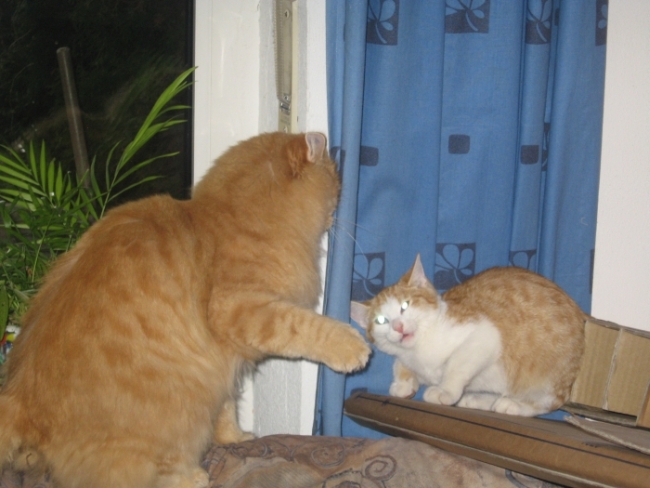 Mein Katerkind Captain hat sich inzwischen super eingelebt. Mein großer Kater Canni konnte ihn zwar anfangs gar nicht leiden, aber jetzt sind sie ein Herz und eine Seele und spielen gerne und viel miteinander. Mein Kater Merlin möchte auch immer gerne mit spielen aber er ist immer ziemlich "ruppig". Ronja, die Mama von Captain möchte am liebsten nur in Ruhe gelassen werden von allen Katern.