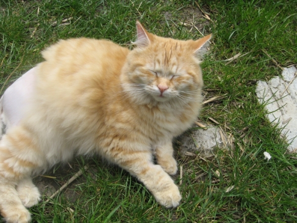 Da ich Merlin zu Hause nicht mehr raus ließ ging ich mit ihm mit der Katzenleine in den Garten an die frische Luft. . Dort scharrte er in der frischen Erde und---- ein erbsengroßes Pfützchen war zu sehen. Am zweiten Tag ein Fingernagelgroßes Pfützchen , dann Cent Stück groß, zwei Eureo groß. Langsam funktionierte die Blase wieder !!! Das Bein wurde gerichtet aber der Schwanz sollte noch abgenommen werden. Während der OP rief mich der Arzt an, es währen noch intakte Nerven da und die Schwanz-Op wurde abgebrochen.