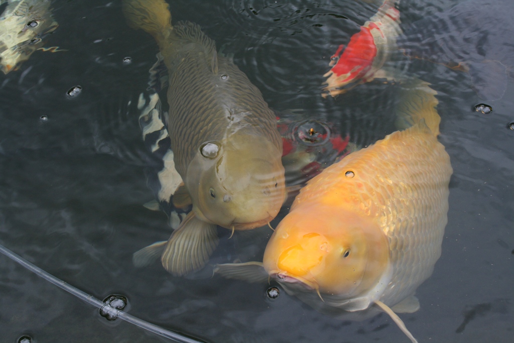 Ja, wir haben einige "Farbenfrohe" Kois und ein paar haben sogar Namen. Da gibt es Frau Hank und Goldi. Uschi und Ulli. Frau Hank und Goldi sind Handzahm. Nuckeln am Finger und kannst die richtig schön streicheln ;) Im Sommer hat mein Freund immer die Füße in den Teich gehalten und die haben am Zeh genuckelt :D Aber alle sind verfressen !!!