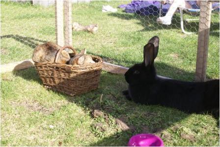 als meine Freundin letztes Jahr unsere Tiere über ein Wochenende mal versorgt hat, hab ich ihr gesagt: "das Kaninchen mit den kurzen Ohren und dem langen Schwanz bitte wieder aus dem Hasenstall entfernen" meine Katzen lieben es bei den Kaninchen im Stall... Sorgen brauch ich mir bei der Größe unserer Häschen keine machen, sie passen absolut nicht ins Beuteschema (sind Deutsche Riesen und werden bis zu 8 kg schwer) Eventl. ist ja das Kaninchen auf dem Foto bald Mama... da werd ich dann mehr aufpassen müssen (sollen um Ostern rum kommen die kleinen Hoppler)