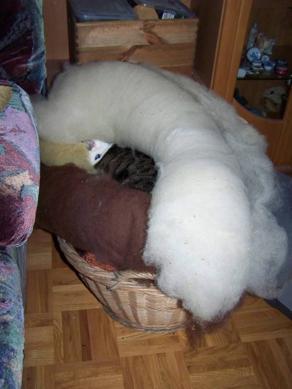 Re: Katzen in SchlafpositionenSuchbild, hier ist eine Katze versteckt...ich hab im wohnzimmer einen großen korb rohwolle stehen, die ich verspinne...eddy liebt wolle.