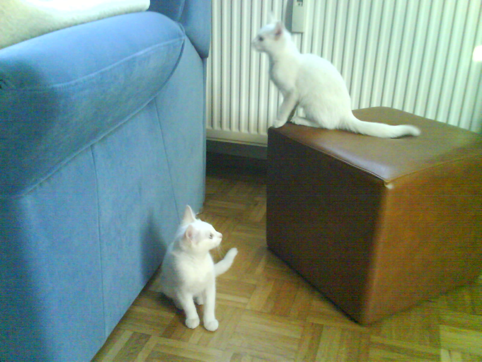 Habe meine Mitzen schon besucht...bin direkt neidisch, wie schnell sie sich an ihre neuen Besitzer gewohnt haben...sie haben mich zwar noch erkannt, kamen gleich...aber als "Neufrauchen" in der Küche geklappert hat...flitz.... :cry: ...aber natürlich bin ich auch sehr froh, dass sie es hier sooo gut haben! sie reduzieren die Dekoration auf dem Fensterbrett, sie fressen brav ihre Mahlzeiten, sie verstecken sich gerne unter dem Sessel , sie gucken gerne vom Kratzbaum aus dem Fenster und liegen gerne abends mit "Neufrauchen und Herrchen" auf dem Sofa...