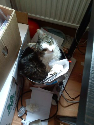 Eure schönsten KatzenfotosRe: Eure schönsten KatzenfotosWenn Frauchen im Arbeitszimmer Bürokram macht kommen dem Romeo so einige Kindheitserimmerungen hoch und da wird eben mal wieder im Müll gewühlt...