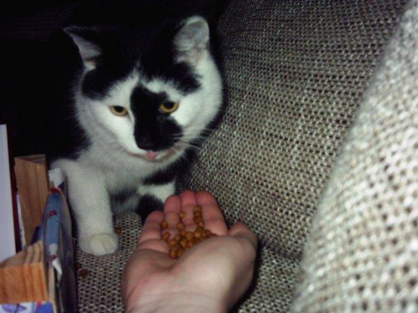 Seit Weihnachten fährt die Frau, die mich mitgenommen hat, eine ganz neue Masche. Mein Futter bekomme ich nur noch von meinem Erzfeind, der Hand! Am Anfang war das wirklich eine Überwindung, aber mitlerweile ist das ganz normal. Und ich inde es lustig wenn die Soße durch die Finger der Menschen tropft!