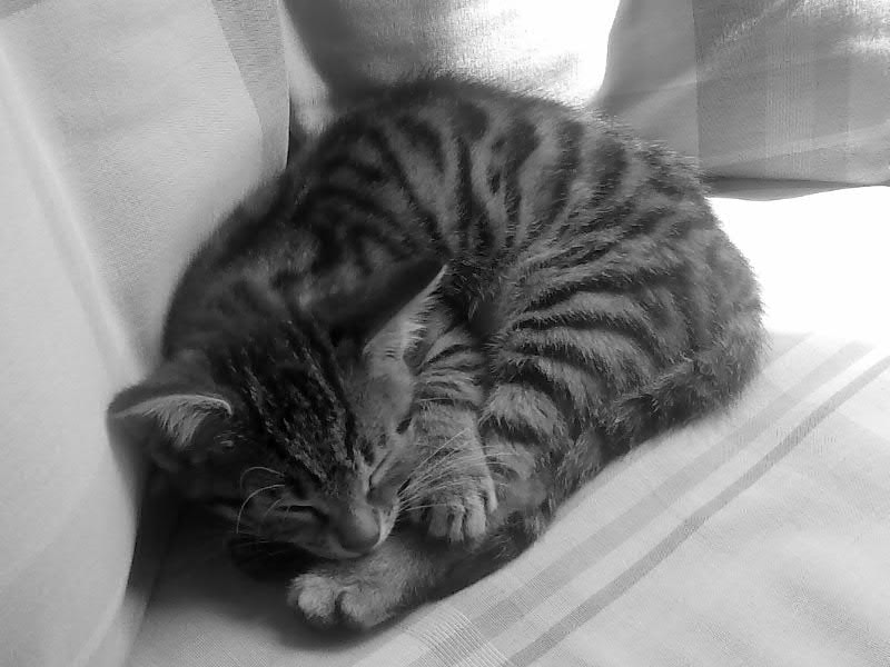 Nani (was noch nicht ihr endgültiger Name ist, da er scheinbar nicht zu ihr passt. Ich nenn sie einfach nur Kleine)- sie ist zwölf Wochen alt und ist, wie es sich für eine kleine Katze nun mal so gehört. Sie spielt, schnurrt und frisst. Und hat eine Vorliebe dafür, mich abzuschlecken und auf meinem Schlüsselbein zu schlafen.