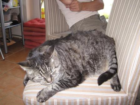 auf dem Stuhl kann man ganz gut erkennen welche Ausmaße der Dicke hat (normalerweise kann ich gut auf dem Stuhl sitzen und meine Katze liegt hinter mir)