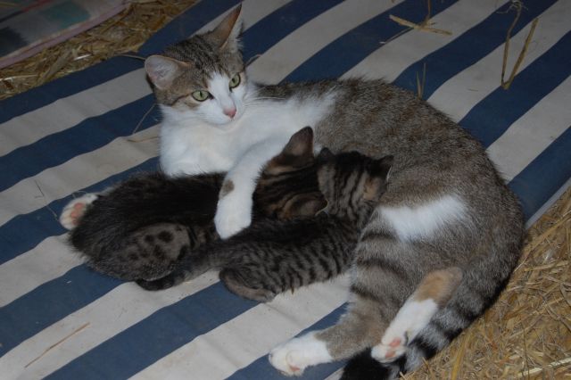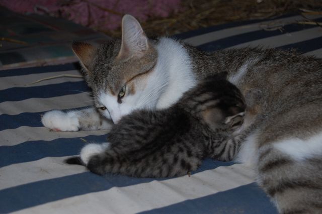 hach war das schön Die Katzenmutti hat unsere gleich abgeschleckt und sie nach einer halben Stunde tatsächlich gesäugt... :D mit den anderen Katzenkindern hat sie auch schon ein bisschen gespielt.