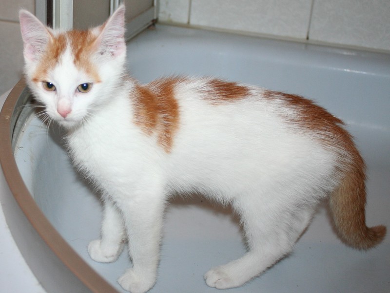 Luna, geb. etwa Mai 2011, ist weiss, mit schwarzen und roten Tupfen, ebenfalls sehr lieb -hat noch nie gekratzt- und spielfreudig.