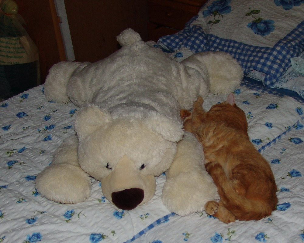 auch wenn benny sehr krank ist sieht man doch das es ihm noch gut geht,er liegt bei seinem knuddelbär lars in unserem bett ,wie man sieht ganz ruhig und entspannt.