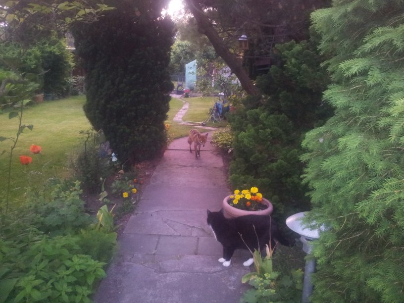 Re: ...wo Fuchs und Katze sich "Gute Nacht" sagen...Hallo, eigentlich recht neutral. Der Fuchs läuft öfters durch die Gärten. Katzi muss ihn wohl kennen.